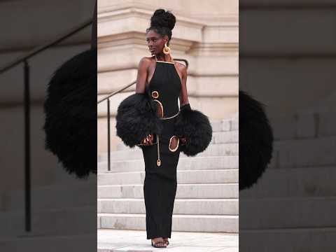 ...Jodie Turner Smith (’long dress in black viscose knit with tree bark effect, embellished with irregular cut-outs trimmed with gold metal and a gold jewel chain at the back. Black fur embroidered jacket’). KC Artis...