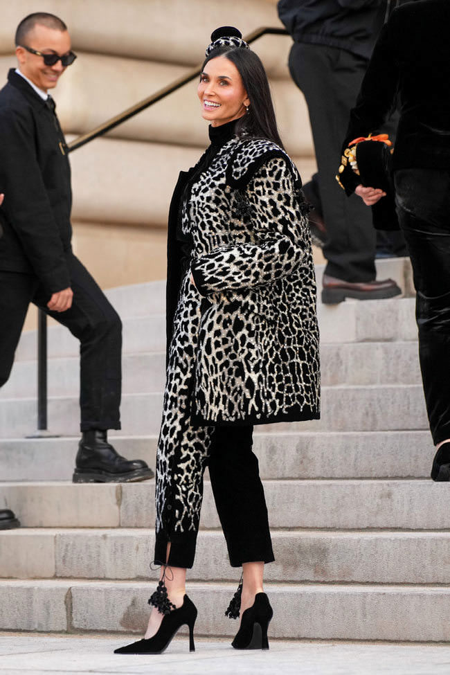 ....Demi Moore (’embroidered leopard coat in matte velvet and washed satin faille embellished with saddle-inspired shoulder pads, matador pompoms and its matching torero pants’) and...
