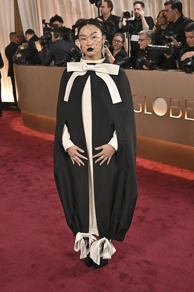 ...love that she didn’t come in some quiet, demure, conventional outfit. No, your girl saw her moment and said “I’m gonna be weird about it.” We still haven’t changed our opinion about bows in fashion (hate ’em), but we love how odd this whole look is’ (TLo).
