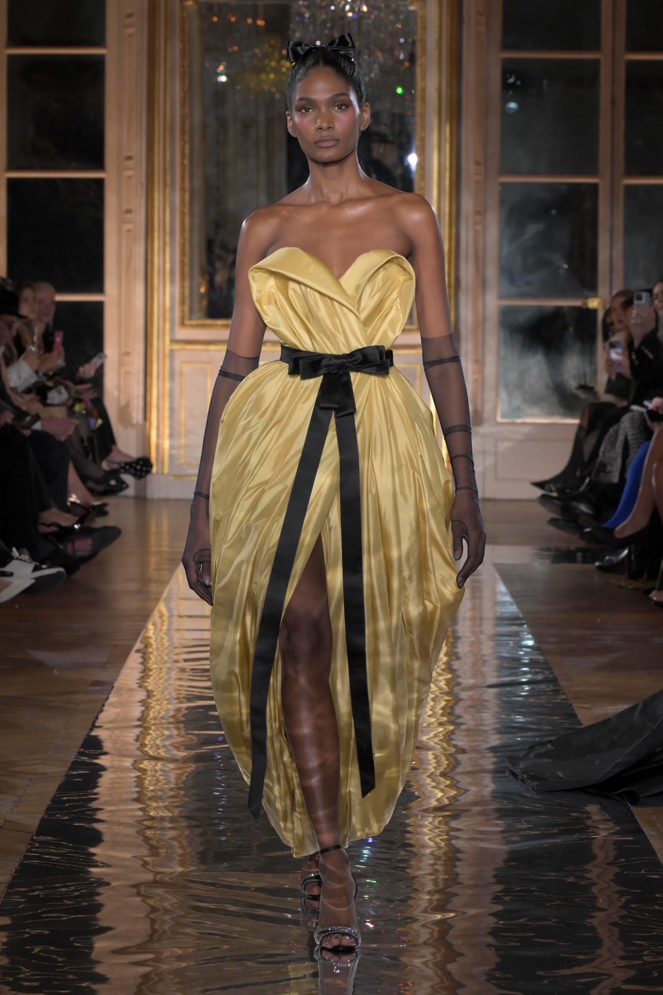 ...a Zuhair Murad ’strapless gown in butter yellow, featuring a gathered bodice, a front slit, and a black belted ribbon detail at the waist’, Look #43 from...